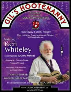 Ken Whiteley, a prolific songwriter, gifted and versatile musician and powerful singer, will headline the 17th Annual and last Gil’s Hootenanny on Friday, May 1st at the First Unitarian Congregation of Ottawa. Whiteley delights his audiences with his participatory humour,...
